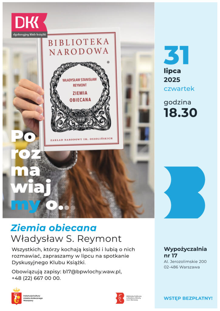 W czwartek 31 lipca 2025 o godz. 18.30 Wypożyczalnia nr 17 zaprasza wszystkich, którzy kochają książki i lubią o nich rozmawiać, na spotkanie Dyskusyjnego Klubu Książki poświęcone powieści Władysława Stanisława Reymonta „Ziemia obiecana”.
