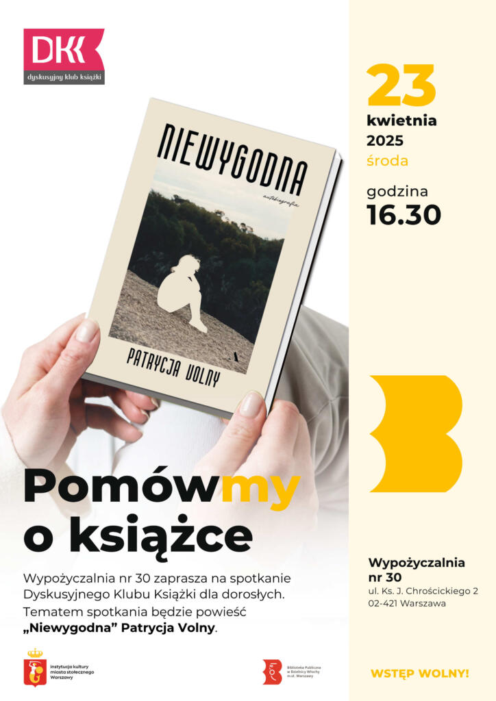 W środę 23 kwietnia 2025 o godz. 16.30 Wypożyczalnia nr 30 zaprasza na spotkanie Dyskusyjnego Klubu Książki dla dorosłych.