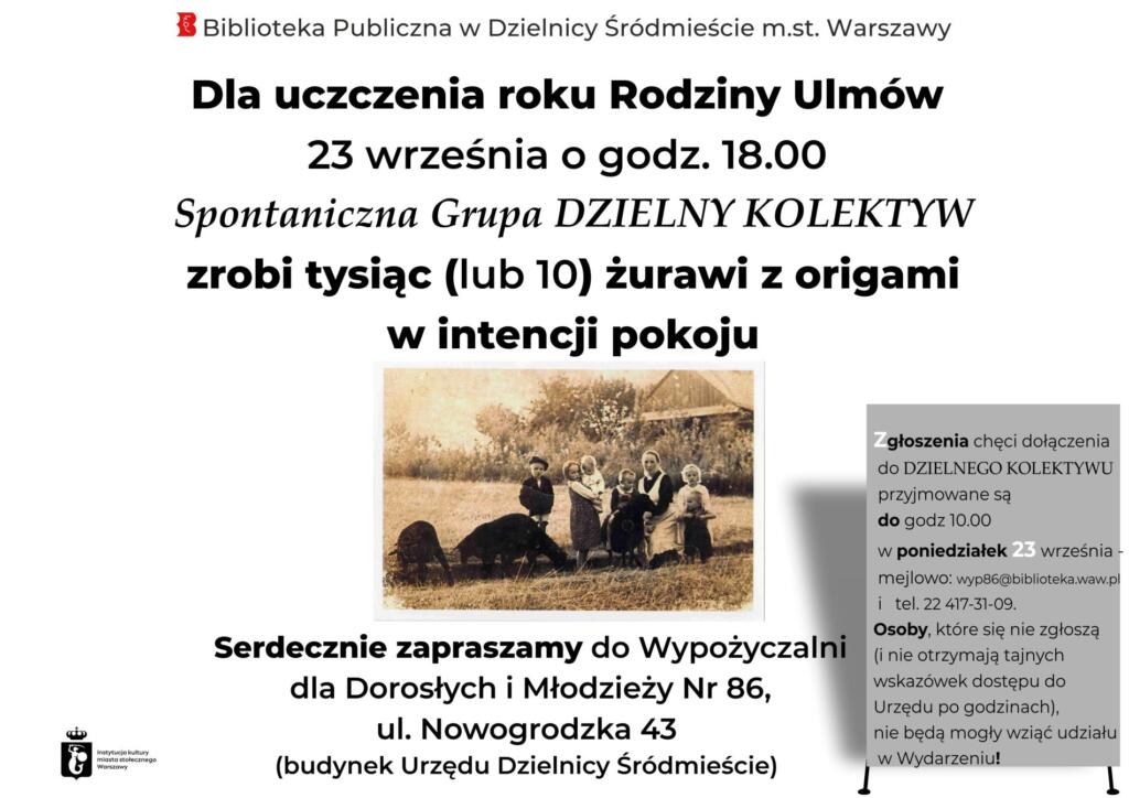 Spontaniczna Grupa DZIELNY KOLEKTYW zaprasza w poniedziałek, 23 września o godzinie 18:00 do Wypożyczalni dla Dorosłych i Młodzieży Nr 86, ul. Nowogrodzka 43 (budynek Urzędu Dzielnicy Śródmieście) na spotkanie dla uczczenia Roku Rodziny Ulmów.