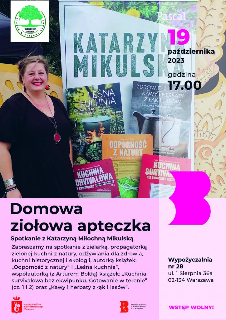 W czwartek 19 października 2023 o godz. 17:00 Wypożyczalnia nr 28 zaprasza na spotkanie z Katarzyną Miłochną Mikulską pt. „Domowa ziołowa apteczka”.
