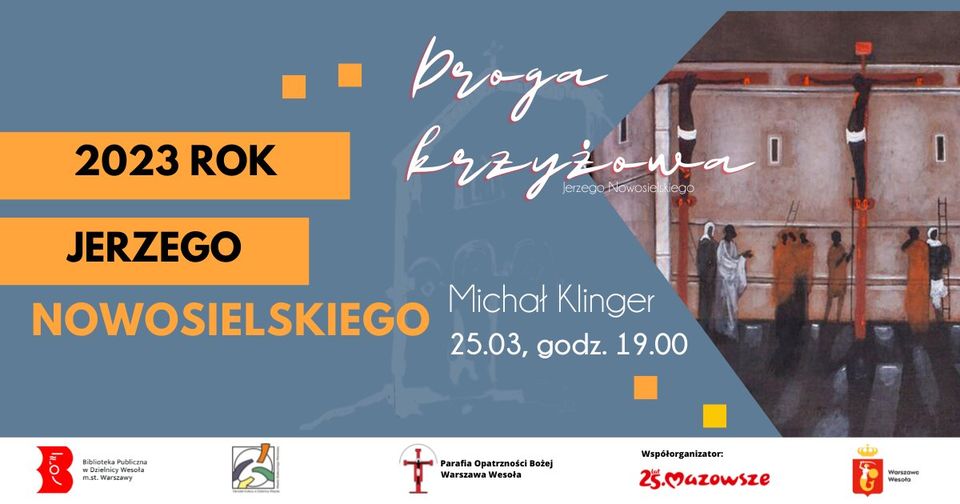 Serdecznie zapraszamy na wykład pana Michała Klingera, który opowie o Drodze Krzyżowej prof. Jerzego Nowosielskiego, znajdującej się w kościele Opatrzności Bożej w Wesołej.