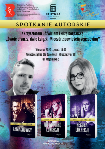 Zapraszamy na spotkanie z Elizą Korpalską, autorką książki “Niewinność Lukrecji” i Krzysztofem Jóźwikiem, autorem książki “Zamachowcy” (wyd. Oficynka). Opowiedzą o pisaniu powieści sensacyjnych z żeńskiej i męskiej perspektywy, zdradzą “pisarskie tricki”, ze szczerością i bez owijania w bawełnę opowiedzą o najtrudniejszych momentach swojej pracy.