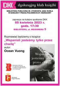 W środę, 5 kwietnia o godz. 17:30, Czytelnia Naukowa NR V, mieszcząca się przy ul. J. Meissnera 5 zaprasza na kolejne, cykliczne spotkanie Dyskusyjnego Klubu Książki. Kwietniowe spotkanie poświęcone będzie dyskusji o książce Ocean Vuong, pt. „Wspaniali jesteśmy tylko przez chwilę”. Wstęp na spotkanie jest bezpłatny.
