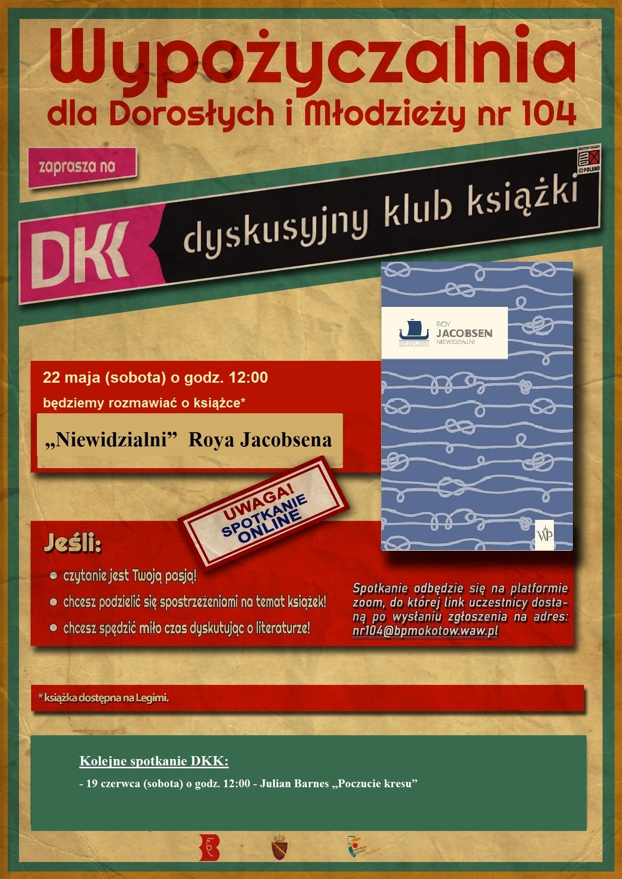 Po raz kolejny chcemy Państwa zaprosić na spotkanie Dyskusyjnego Klubu Książki, które odbędzie się 22 maja o godzinie 12:00. Będziemy rozmawiać o książce „Niewidzialni” Roya Jacobsena.