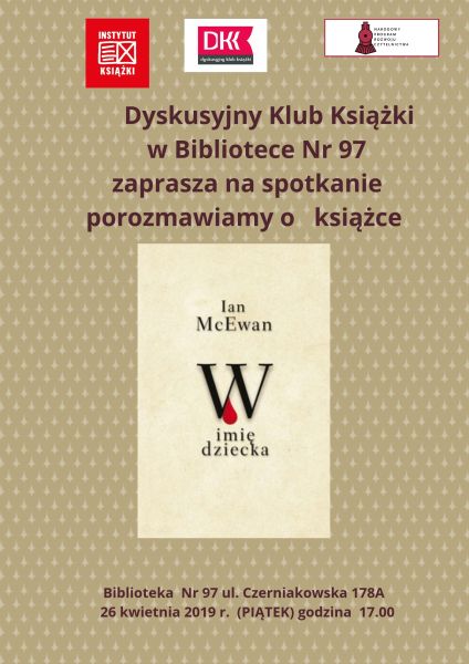 Dyskusyjny Klub Książki, działający w Wypożyczalni Nr 97, zaprasza na spotkanie 26 kwietnia 2019 (piątek) o godzinie 17:00. Tematem dyskusji będzie książka: „W imię dziecka”, autor Ian McEwan.