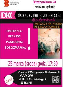 Wypożyczalnia nr 30 zaprasza na spotkanie Dyskusyjnego Klubu Książki, podczas którego podyskutujemy tym razem o książce J. Kavanagh – „Dziewczyna, która kochała kamelie”.