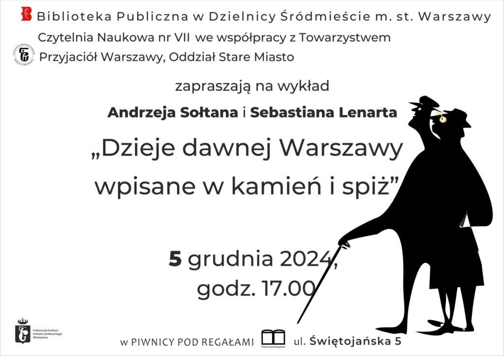 Biblioteka Publiczna w Dzielnicy Śródmieście m.st. Warszawy, Czytelnia Naukowa Nr VII we współpracy z Towarzystwem Przyjaciół Warszawy, zaprasza 5 grudnia o godzinie 17:00 na wykład varsavianistyczny Andrzeja Sołtana i Sebastiana Lenarta pt. „Dzieje dawnej Warszawy wpisane