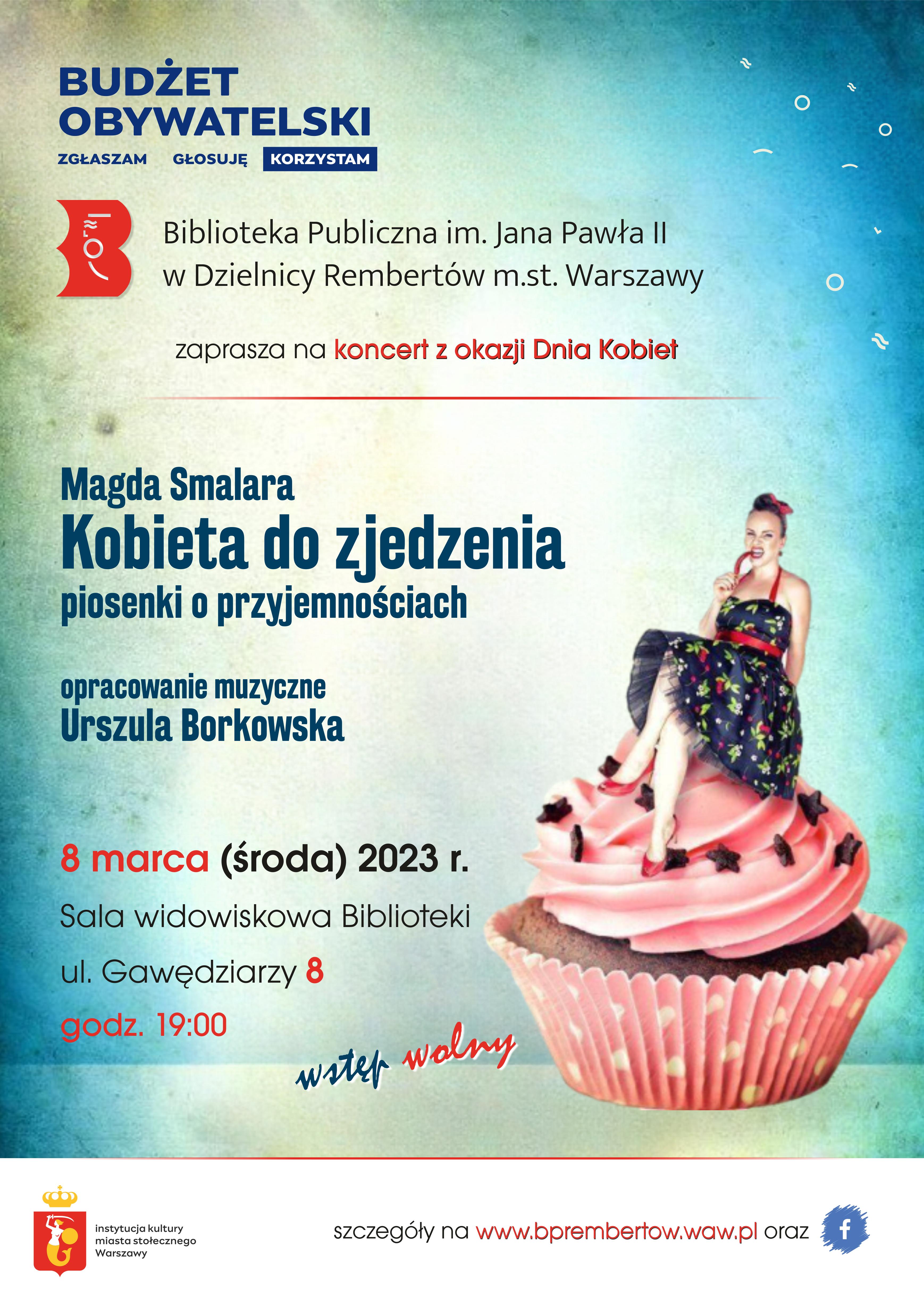 „Kobieta do zjedzenia” to koncert, spektakl i zabawny gastro-recital. Z okazji Dnia Kobiet zapraszamy na muzyczny wieczór w rembertowskiej bibliotece. Wydarzenie odbędzie się 8 marca, o godzinie 19:00 w sali widowiskowej przy ulicy Gawędziarzy 8. Wstęp wolny.