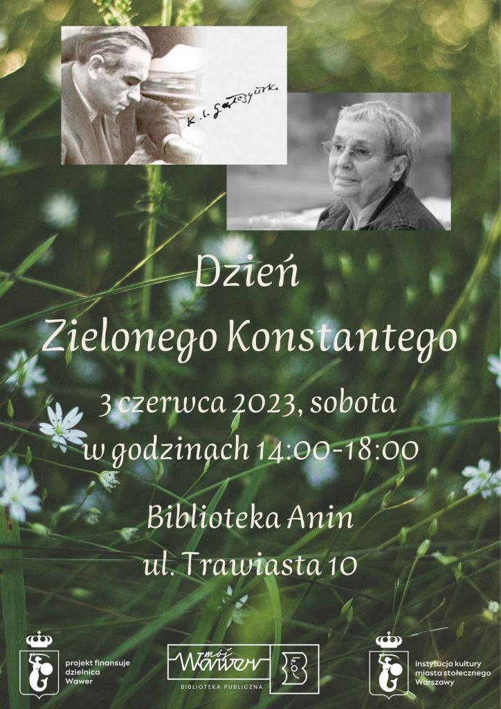 Od ponad dwudziestu lat w pierwszą sobotę czerwca, w Bibliotece w Aninie odbywa się „Dzień Zielonego Konstantego”. Wydarzenie jest jedną z najważniejszych dat w kalendarzu Biblioteki, ponieważ honoruje Patrona Wypożyczalni dla dorosłych nr 87, która znajduje się w siedzibie głównej Biblioteki Wawerskiej przy ul. Trawiastej 10. Wydarzenie jest adresowane do miłośników twórczości Konstantego Ildefonsa Gałczyńskiego, mieszkańców Warszawy i Dzielnicy Wawer oraz społeczności Anina, w którym mieszkał Konstanty Ildefons Gałczyński. Tegoroczna edycja jest wyjątkowa, bowiem w 2023 roku mija 70. rocznica śmierci Poety, a jednocześnie żegnamy Kirę Gałczyńską, córkę Poety, pisarkę i propagatorkę jego twórczości, która odeszła w grudniu zeszłego roku.