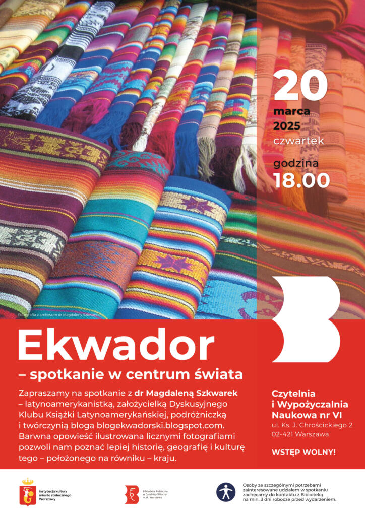 W czwartek 20 marca 2025 o godz. 18.00 zapraszamy do Czytelni i Wypożyczalni Naukowej nr VI na spotkanie z latynoamerykanistką dr Magdaleną Szkwarek pt.: „Ekwador – spotkanie w centrum świata”.