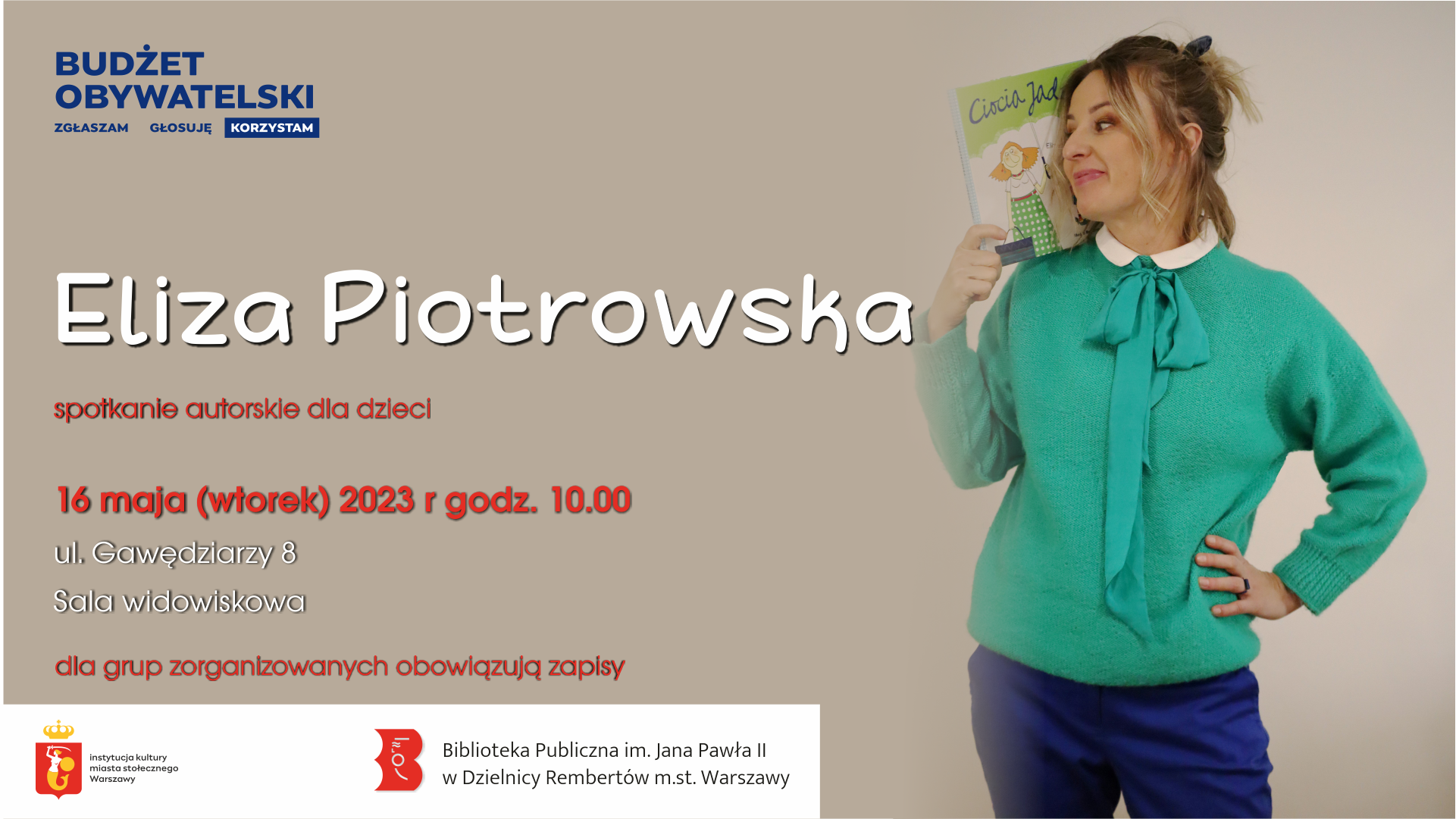 Eliza Piotrowska, jedna z najbardziej lubianych autorek i ilustratorek książek dla dzieci, odwiedzi bibliotekę przy ul. Gawędziarzy 8 już 16 maja o godz.10.00. Wydarzenie zostanie realizowane w ramach Budżetu Obywatelskiego.