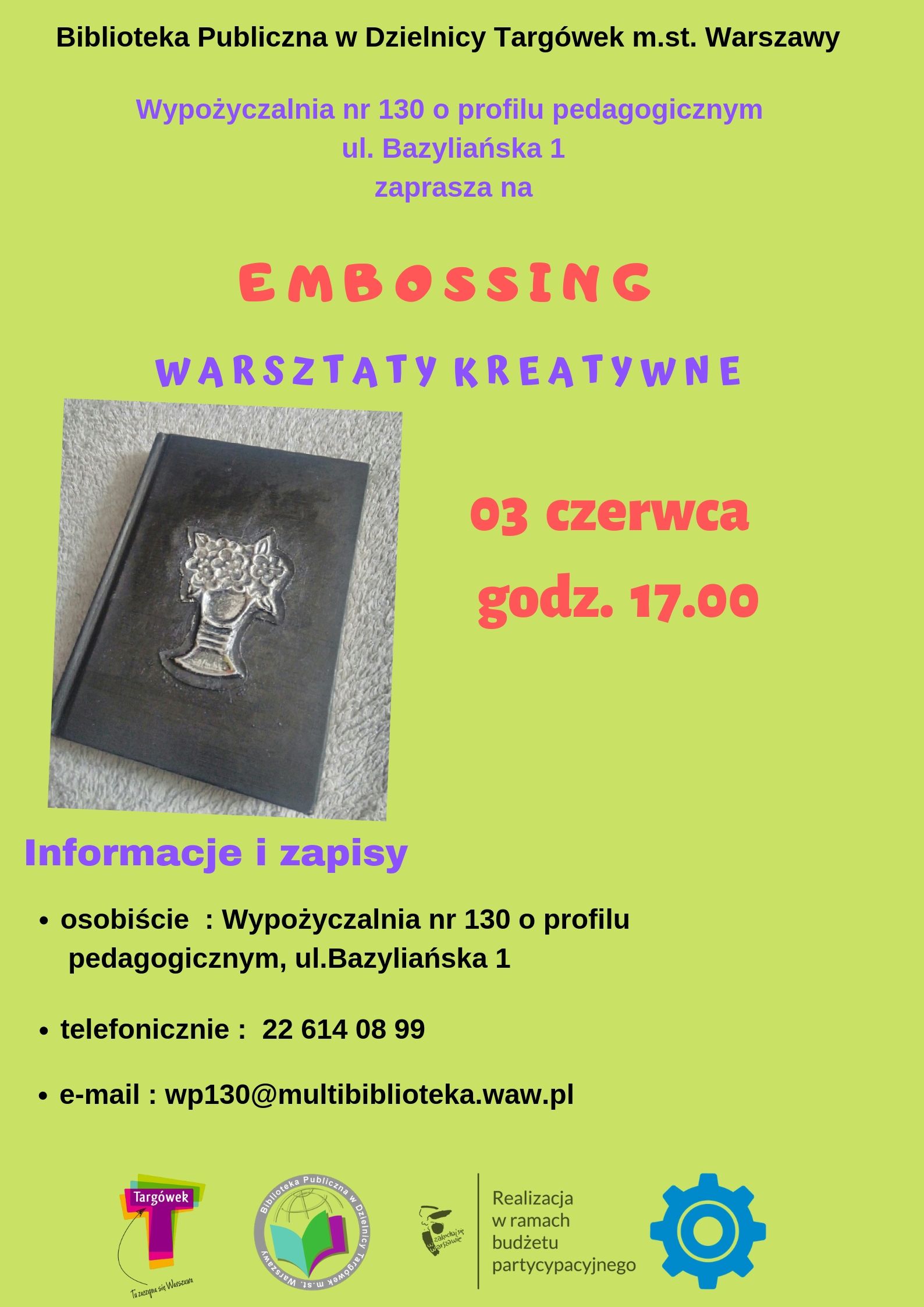 Biblioteka Publiczna w Dzielnicy Targówek m.st. Warszawy zaprasza na warsztaty kreatywne pt. „Embossing”.