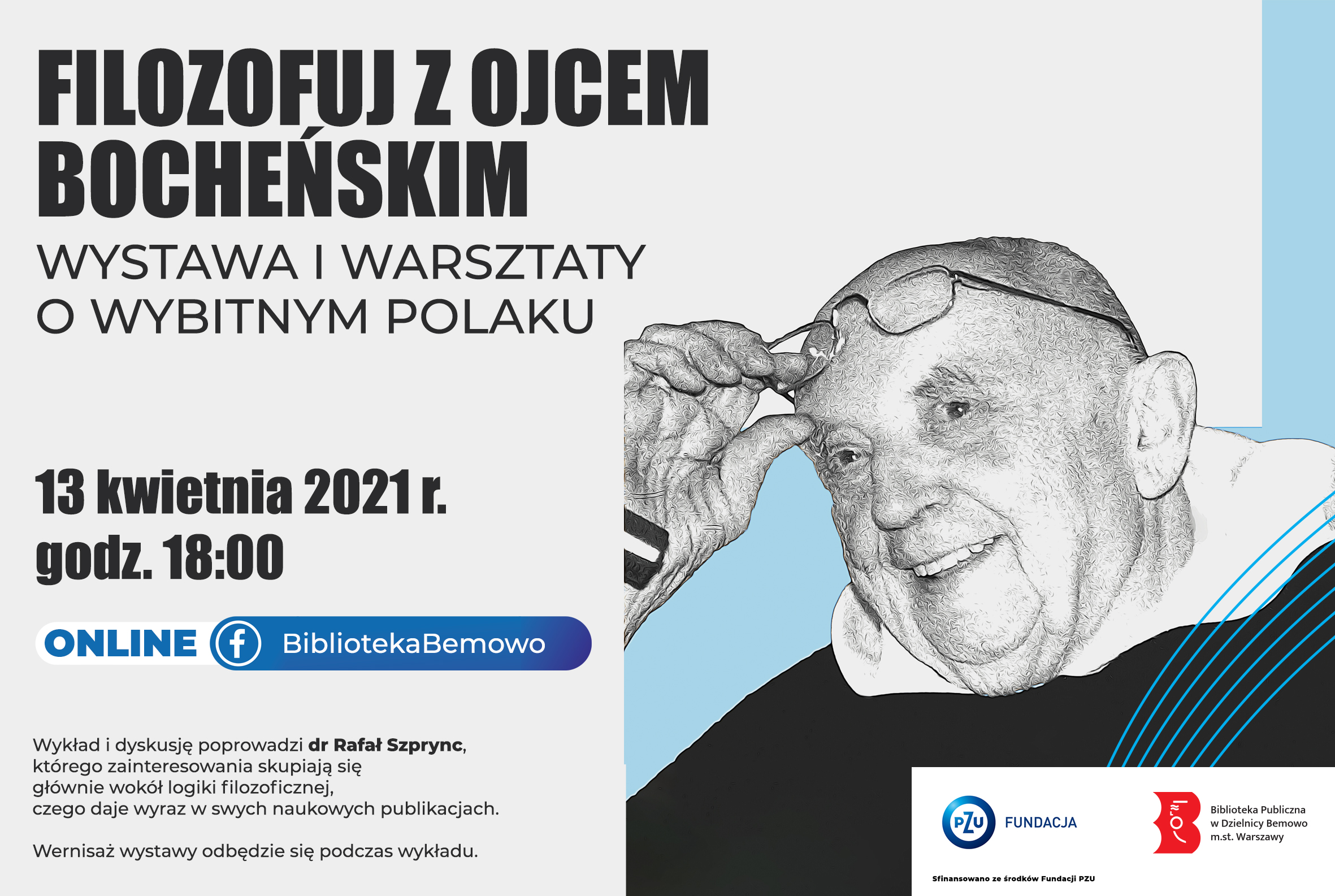W ramach projektu 13 kwietnia br. o godz. 18:00 zaplanowano wykład dr. Rafała Szprynca, autora publikacji naukowych o logice filozoficznej. Podczas spotkania zostanie zaprezentowana również wystawa o o. Bocheńskim, zawierająca rysunki bohatera projektu w wykonaniu pracowników oraz współpracowników bemowskiej biblioteki. Spotkanie odbędzie się w w trybie online – Live na kanale YouTube i na fanpage’u Biblioteki. Wykład będzie również dostępny jako webinarium na kanale YouTube Biblioteka Bemowo oraz na e- platformie bibliotecznej. Projekt sfinansowała Fundacja PZU.