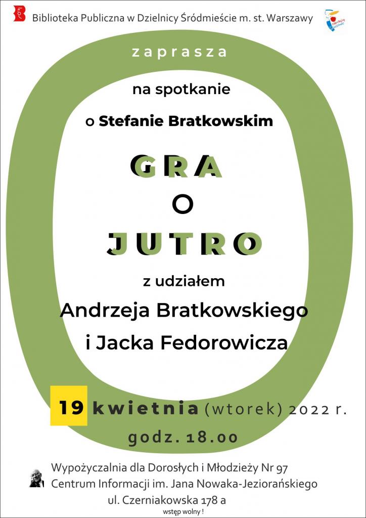 Biblioteka Publiczna w Dzielnicy Śródmieście m.st. Warszawy zaprasza we wtorek 19 kwietnia o godzinie 18:00 do Wypożyczalni dla Dorosłych i Młodzieży nr 97 przy ulicy Czerniakowskiej 178A, na spotkanie o Stefanie Bratkowskim, z udziałem Andrzeja Bratkowskiego i Jacka Fedorowicza.