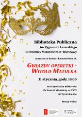 Multimedialna Biblioteka dla dzieci i Młodzieży, ul. Tyniecka 40 zaprasza na koncert karnawałowy: Gwiazdy Operetki Witold Matulka.