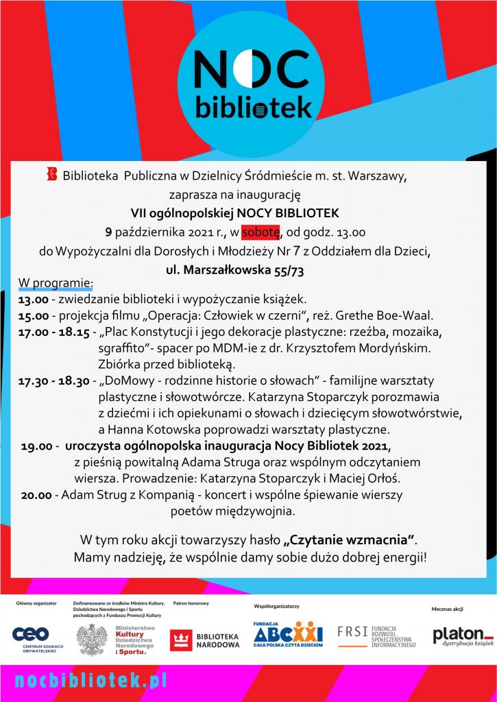 Biblioteka Publiczna w Dzielnicy Śródmieście m.st. Warszawy zaprasza na inaugurację VII ogólnopolskiej NOCY BIBLIOTEK 2021 do Wypożyczalni dla Dorosłych i Młodzieży nr 7 z Oddziałem dla Dzieci, ul. Marszałkowska 55/73, Warszawa, 9 października 2021.
