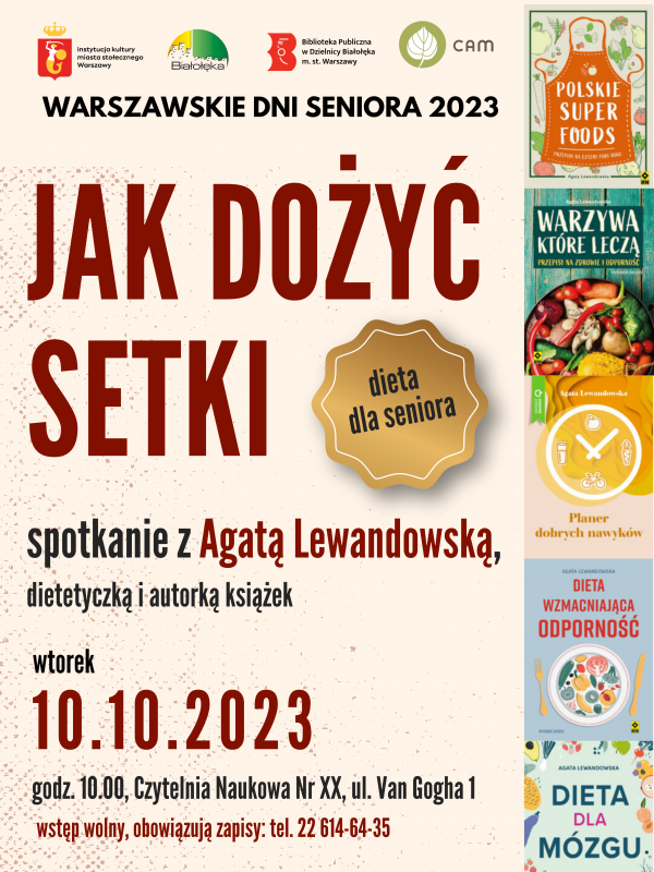 Serdecznie zapraszamy na spotkanie z dietetyczką i autorką książek o zdrowym odżywianiu – Agatą Lewandowską. Odbędzie się ono 10 października (wtorek) o godz. 10:00, w Czytelni Naukowej Nr XX (ul. Van Gogha 1). Na spotkanie jest wstęp wolny, ale obowiązują zapisy pod numerem telefonu: 22 614 64 35.