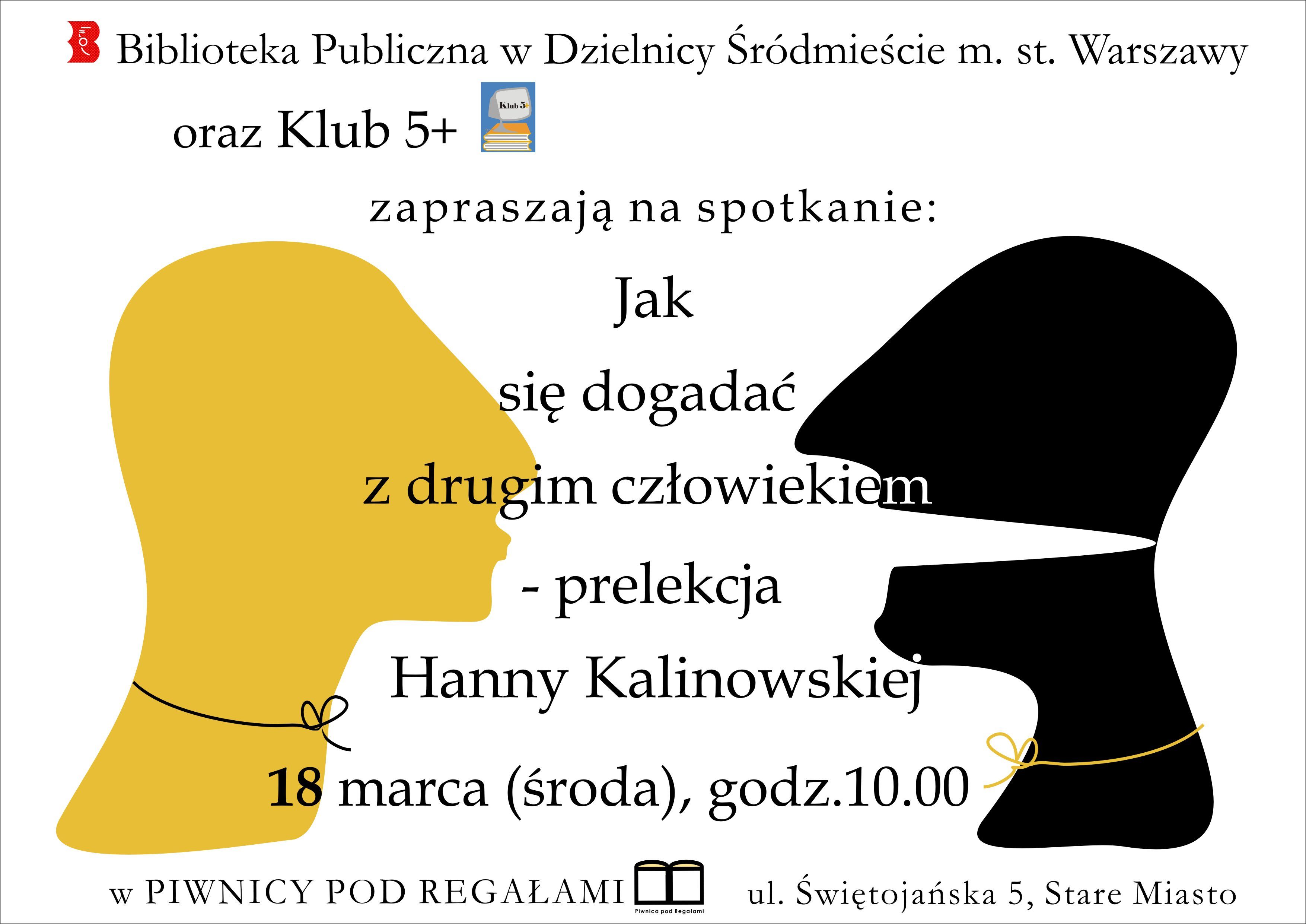 Biblioteka Publiczna w Dzielnicy Śródmieście m.st. Warszawy oraz Klub 5+, zapraszają na prelekcję Hanny Kalinowskiej pt. „Jak się dogadać z drugim człowiekiem”. Spotkanie odbędzie się w środę 18 marca o godzinie 10:00 w Piwnicy pod Regałami przy ul. Świętojańskiej 5.