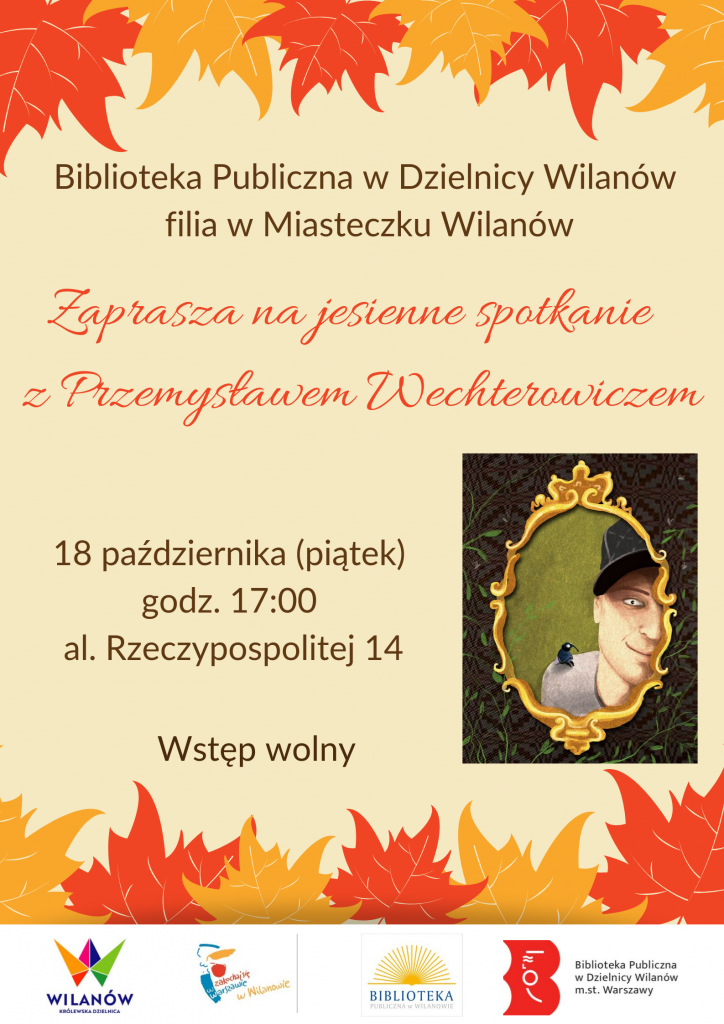 Czy wiecie o czym marzył mały Przemysław Wechterowicz? Jak to się stało, że został pisarzem? Chcielibyście się dowiedzieć, jak wygląda praca nad książką? Czy każdy dzień pisarza jest inny? Jeśli tak, zapraszamy Was 18 października (piątek) o godzinie 17:00 do Biblioteki przy al. Rzeczypospolitej 14 na jesienne spotkanie z Przemysławem Wechterowiczem. Poznamy bliżej autora książek „Czy ktoś widział zajączka?”, „Lukrecji”, „Małego słownika wyrazów kocich i kociojęzycznych”. Posłuchamy również o tym, co możemy znaleźć na kartach jego dzieł. Ponieważ każdy z nas ma marzenia, porozmawiamy o tym, co zaprząta nasze głowy i sny, a następnie przeniesiemy te wyobrażenia na kartki. Być może z tych właśnie marzeń powstaną kiedyś książki podobne do tych, które pisze nasz gość.