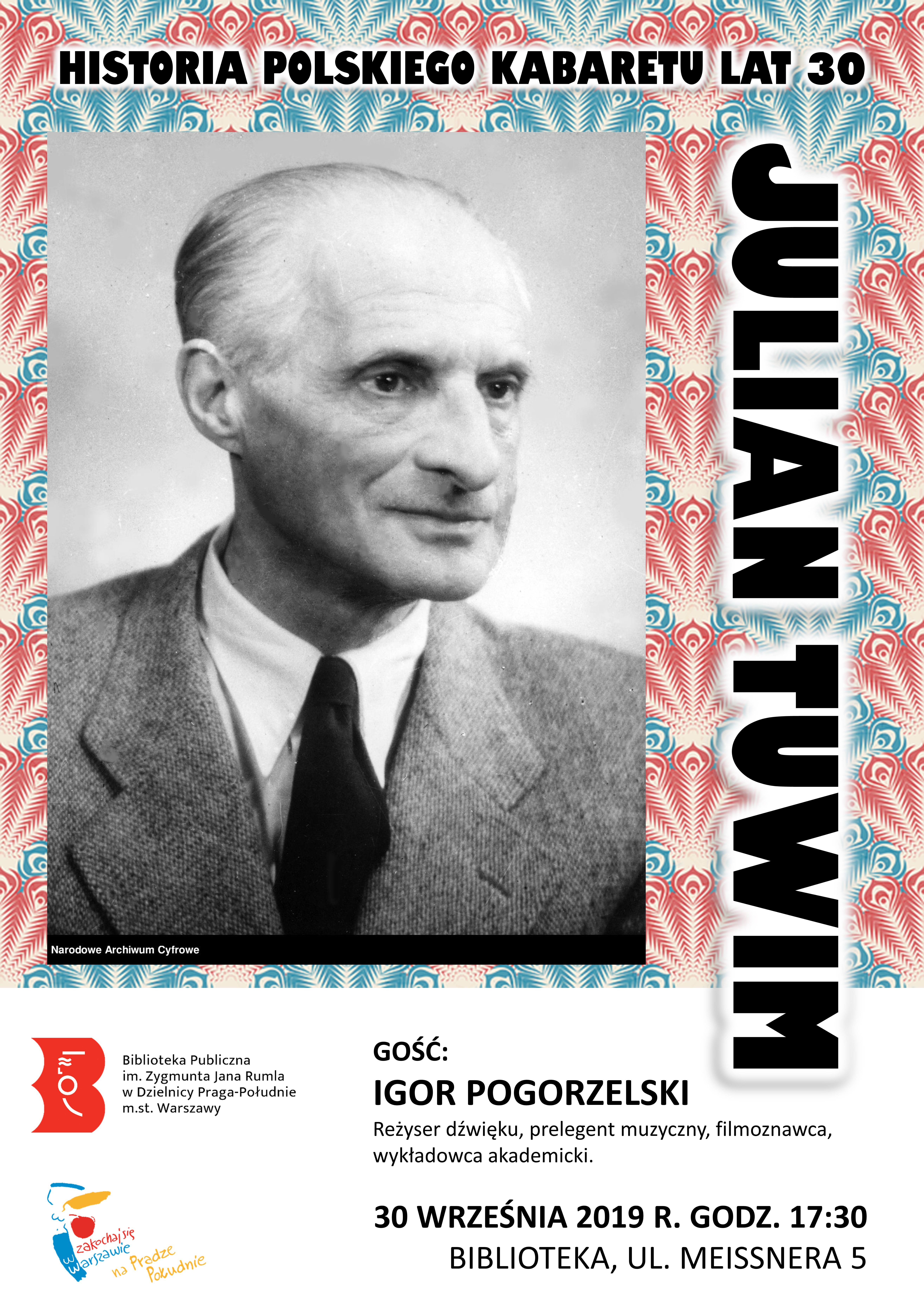 Ta barwna postać polskiego kabaretu, miała niebagatelny wpływ na całe satyryczne światek lat 20. i 30. w Polsce. Choć wiele dzieł Juliana Tuwima znamy choćby ze szkolnych czasów, to fakt, że jest on autorem szlagierów „Miłość Ci wszystko wybaczy”, czy „Na pierwszy znak”, jest dla wielu zaskoczeniem. Na spotkaniu z Igorem Pogorzelskim, reżyserem dźwięku, prelegentem muzycznym, filmoznawcą, wykładowcą akademickim, przybliżymy więc tę nietuzinkową postać.