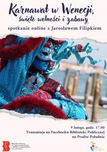Karnawał to co roku czas radości i wolności, poprzedzający Środę Popielcową i czterdziestodniowy okres Wielkiego Postu. Na całym świecie wiążą się z nim unikalne tradycje i zwyczaje, jak choćby polskie Zapusty, czy brazylijska zabawa na Sambodromie w Rio de Janeiro. Niewątpliwie najsłynniejszym karnawałem jest ten, organizowany w Wenecji. Jego korzenie sięgają XI wieku. Aby przybliżyć nam wszystkim ciekawostki związane z tym niezwykłym corocznym wydarzeniem, południowopraska Biblioteka Publiczna im. Zygmunta Jana Rumla organizuje spotkanie online, pt. „Karnawał w Wenecji. Święto wolności i zabawy”. Na transmisję zapraszamy w środę, 9 lutego o godz. 17:00, na facebooka Biblioteki – www.facebook.com/Biblioteka.Praga.Poludnie. Gościem wydarzenia będzie artysta Jarosław Filipek.