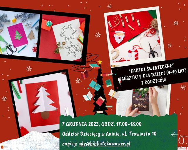 Zapraszamy dzieci w wieku 4-10 lat wraz z opiekunami na warsztaty tworzenia kart świątecznych, które odbędą się 7 grudnia o godzinie 17.00 w Oddziale Dziecięcym w Aninie przy ul. Trawiastej 10.