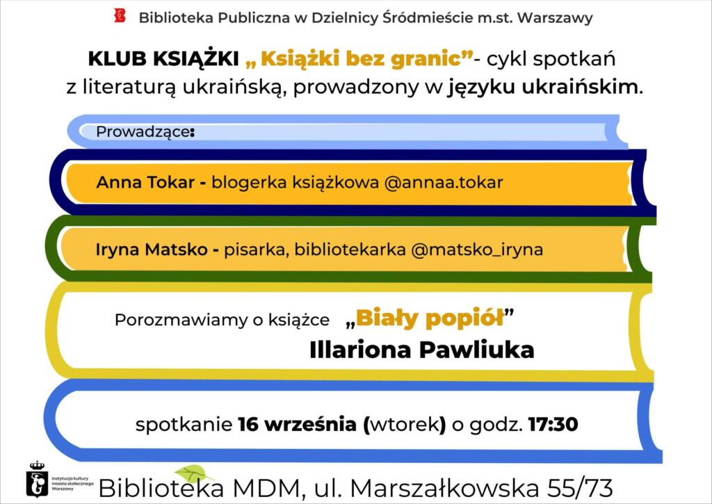 Biblioteka Publiczna w Dzielnicy Śródmieście m.st. Warszawy zaprasza na Klub Książki Ukraińskiej dla dorosłych – cykl spotkań z literaturą ukraińską, prowadzony w języku ukraińskim.