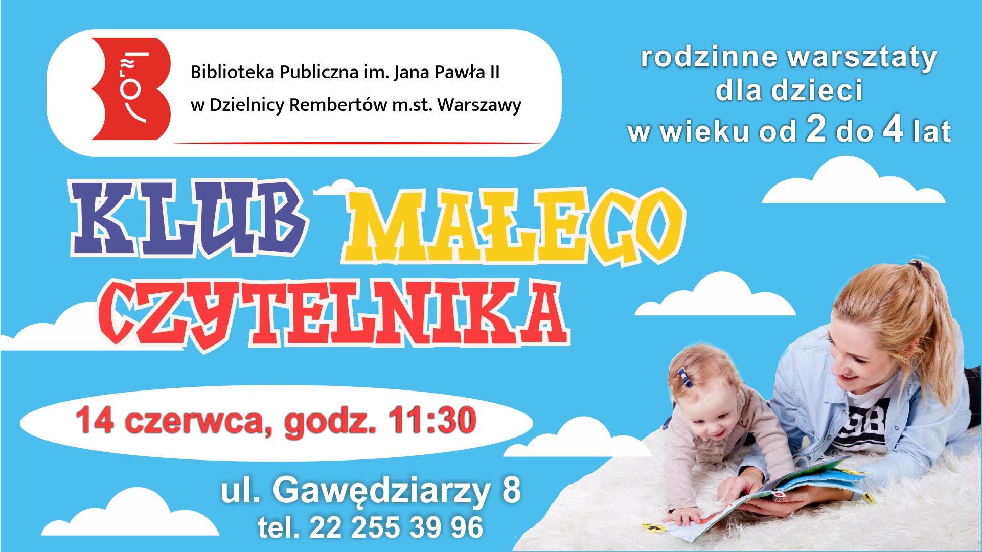 Zapraszamy dzieci w wieku 2-4 lat wraz z opiekunami na zajęcia Klubu Małego Czytelnika, które odbędą się w piątek 14 czerwca 2019 r. o godzinie 11:30 w Bibliotece przy ul. Gawędziarzy 8.