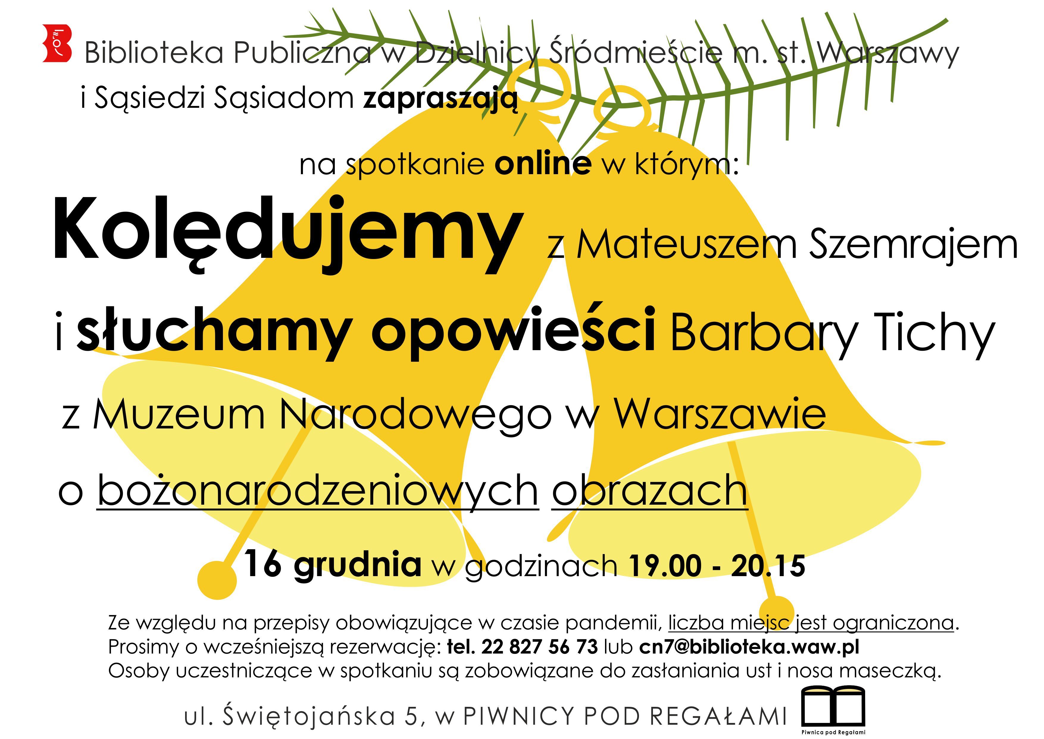 Biblioteka Publiczna w Dzielnicy Śródmieście m.st. Warszawy i Sąsiedzi Sąsiadom zapraszają na spotkanie online, w którym: Kolędujemy z Mateuszem Szemrajem i słuchamy opowieści Barbary Tichy z Muzeum Narodowego w Warszawie o bożonarodzeniowych obrazach.