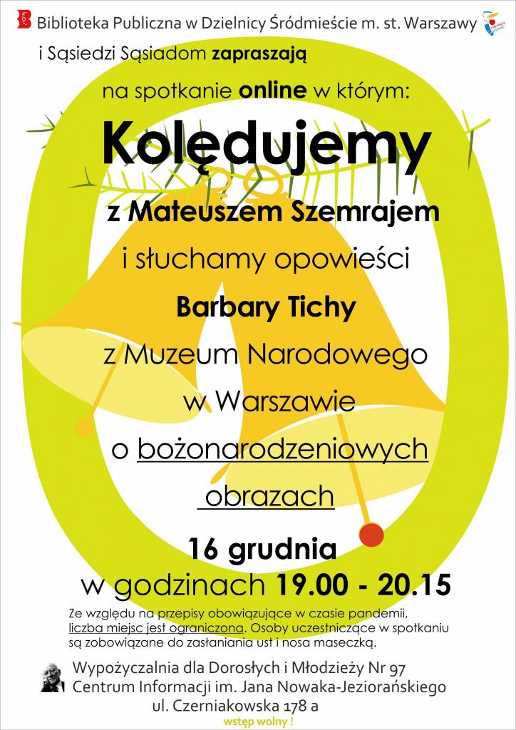 Biblioteka Publiczna w Dzielnicy Śródmieście m.st. Warszawy i Sąsiedzi Sąsiadom zapraszają na spotkanie online, w którym: Kolędujemy z Mateuszem Szemrajem i słuchamy opowieści Barbary Tichy z Muzeum Narodowego w Warszawie o bożonarodzeniowych obrazach.