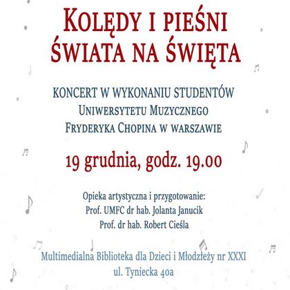 Multimedialna Biblioteka dla Dzieci i Młodzieży nr XXXI, ul. Tyniecka 40a zaprasza na „Kolędy i pieśni świata” w wykonaniu studentów Uniwersytetu Muzycznego Fryderyka Chopina.