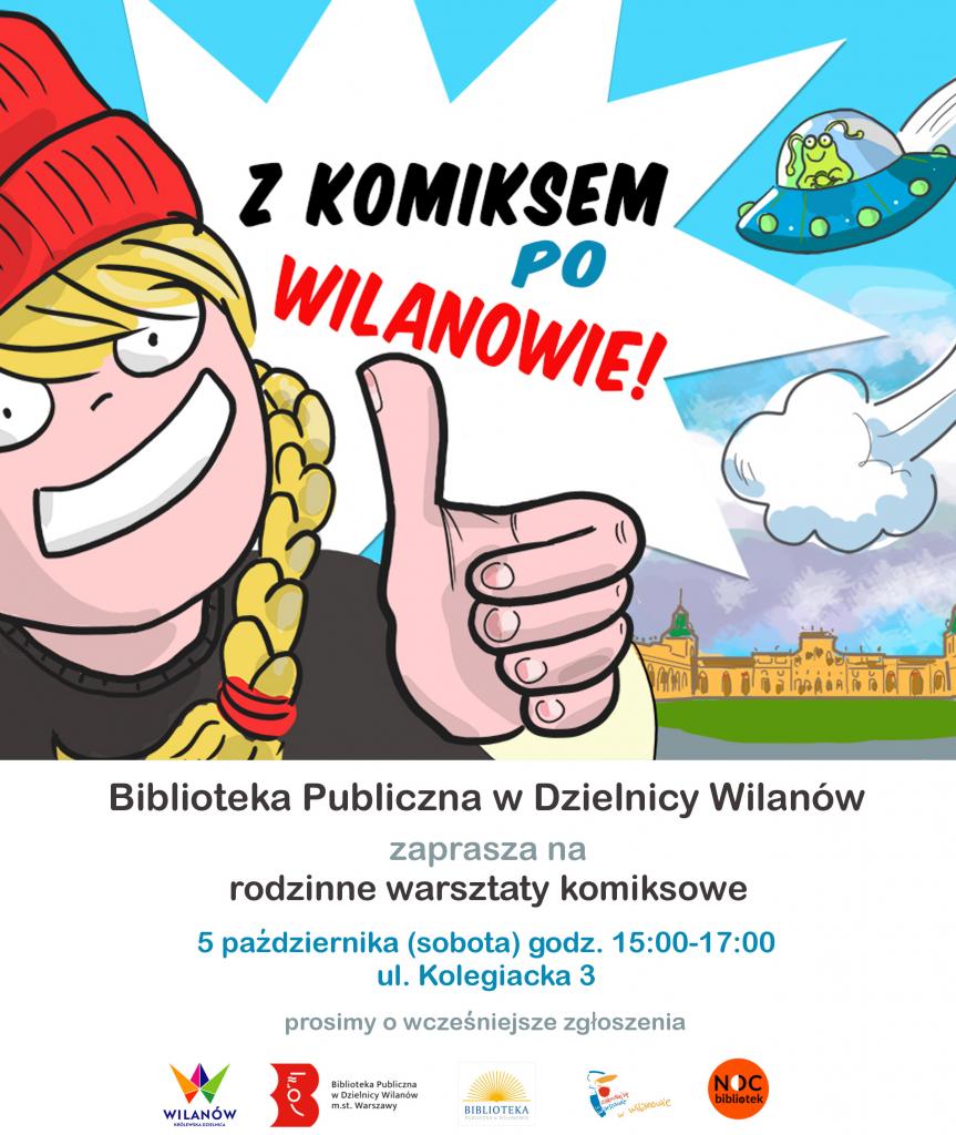 Wyobraźcie sobie kosmitę, który przebył długą drogę na Ziemię. Pragnie zwiedzić właśnie Wilanów. Pyta Was o miejsca godne polecenia. Co mu odpowiecie? Być może wskażecie pałac króla Jana III Sobieskiego, Plażę na Kępie Zawadowskiej, Most Zakochanych. A może użyjecie innego klucza i pokażecie mu miejsca, w których najbardziej lubicie spędzać czas? W sobotę 5 października o godzinie 15:00 w czasie warsztatów rodzinnych „Komiksowy przewodnik po Wilanowie”, wcielimy się w rolę przewodników miejskich i artystów. Wspólnie stworzymy jedyny w swoim rodzaju przewodnik po naszej dzielnicy. Czekamy na Was w Bibliotece przy ul. Kolegiackiej 3. Nie może Was zabraknąć!