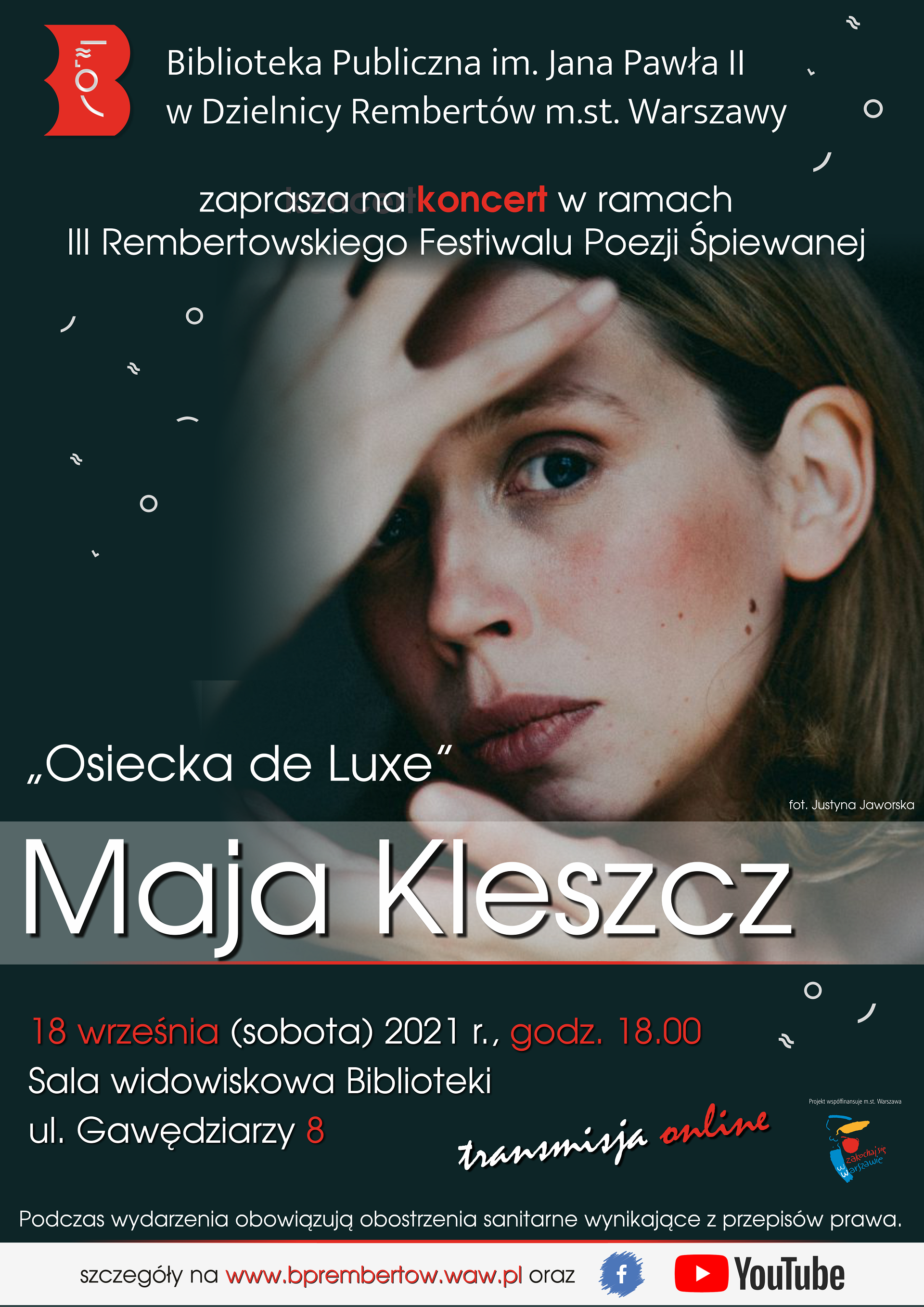 Już 18 września o godz. 18:00, w sali widowiskowej Biblioteki przy ul. Gawędziarzy 8, wystąpi Maja Kleszcz z repertuarem z płyty „Osiecka de Luxe”. Koncert będzie doskonałym zwieńczeniem III Rembertowskiego Festiwalu Poezji Śpiewanej. Przed gwiazdą wieczoru wystąpią laureaci konkursu.