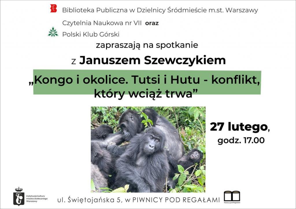 27 lutego o godzinie 17:00 do „Piwnicy pod Regałami” (ul. Świętojańska 5) na spotkanie z Januszem Szewczykiem pt. „Kongo i okolice.