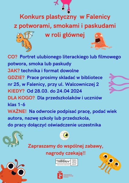 Filia w Falenicy zaprasza młodych czytelników do wzięcia udziału w konkursie plastycznym. Sprawa jest prosta: w dowolnej technice tworzymy ulubionego literackiego lub filmowego smoka, potwora, paskudę.