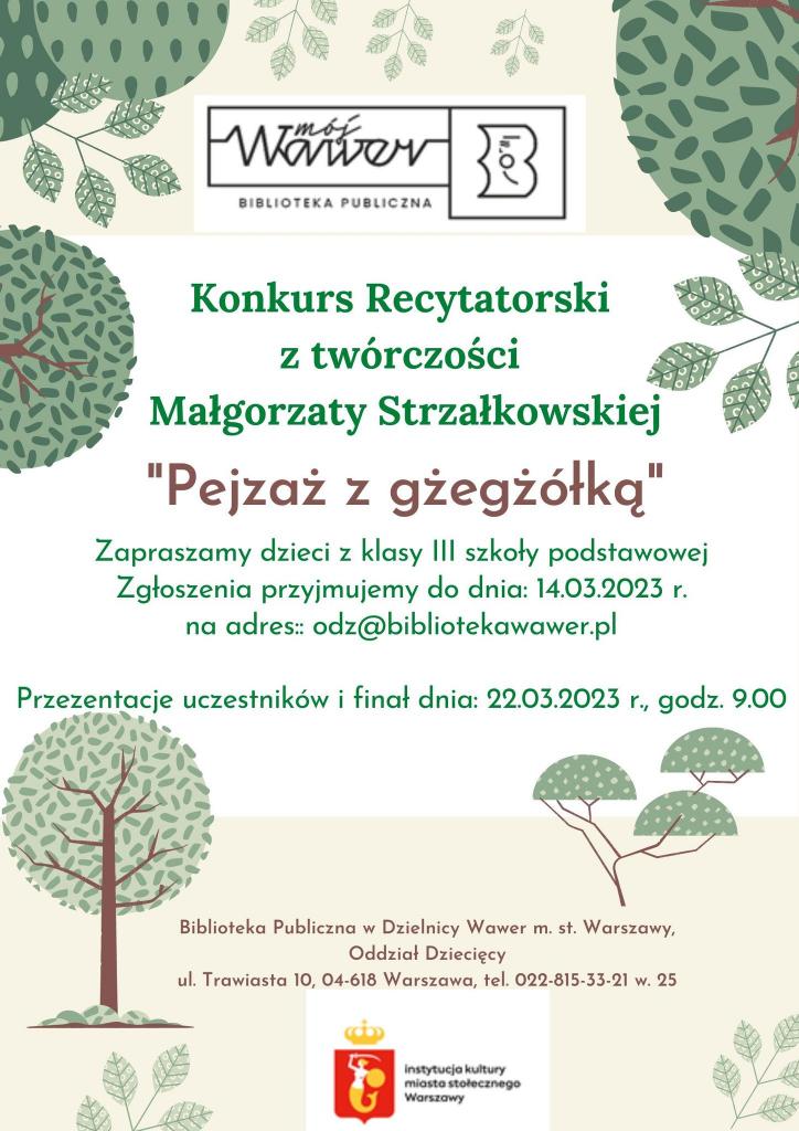 Zapraszamy uczniów klas trzecich szkoły podstawowej do udziału w Konkursie Recytatorskim na podstawie twórczości Małgorzaty Strzałkowskiej pn. „Pejzaż z gżegżółką”.