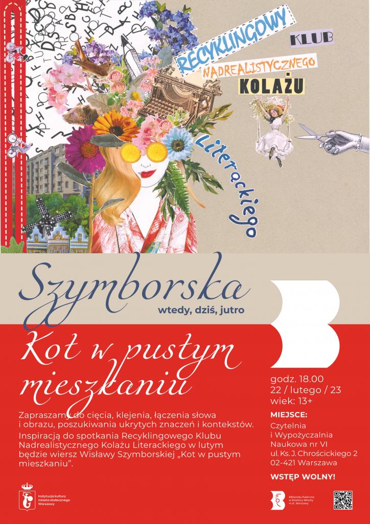 W środę 22 lutego 2023 o godz. 18.00 zapraszamy do Czytelni i Wypożyczalni Naukowej nr VI na spotkanie Recyklingowego Klubu Nadrealistycznego Kolażu Literackiego inspirowane wierszem Wisławy Szymborskiej „Kot w pustym mieszkaniu”. Będziemy ciąć, kleić, łączyć słowa i obrazy, poszukiwać ukrytych znaczeń i kontekstów. Wstęp wolny.
