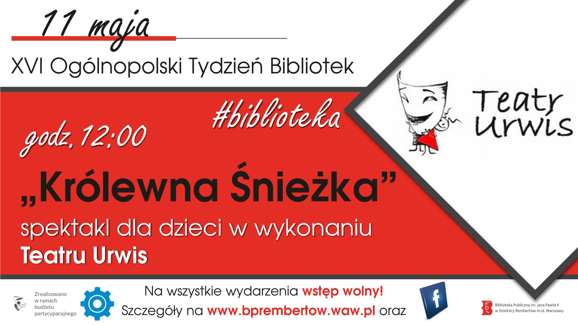 Z okazji Tygodnia Bibliotek Biblioteka Publiczna im. Jana Pawła II zaprasza dzieci na spektakl pt. „Królewna Śnieżka”. Przedstawienie obędzie się w sobotę 11 maja 2019, godz. 12:00 w Bibliotece przy ul. Gawędziarzy 8.