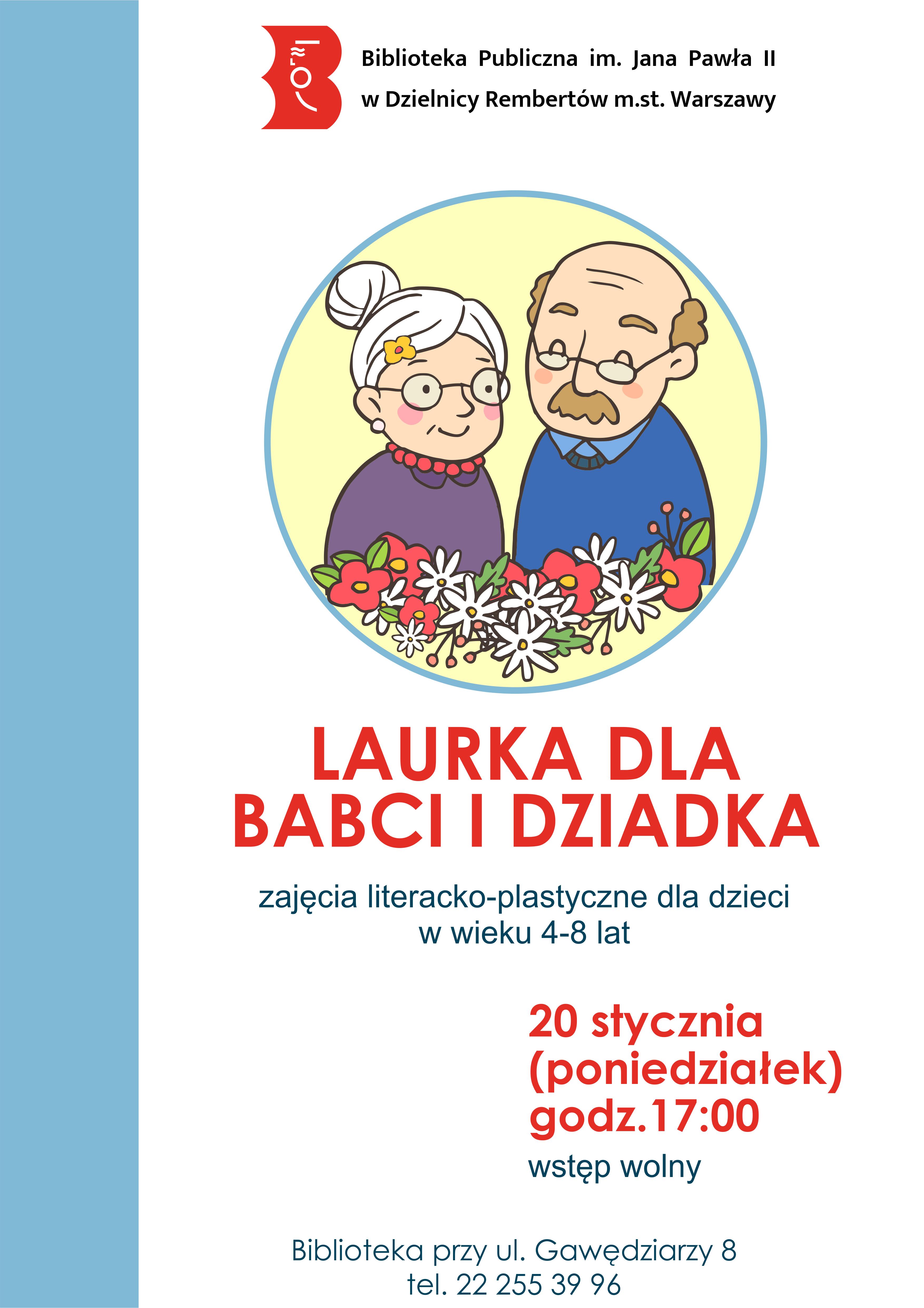 Z okazji zbliżającego się Dnia Babci i Dziadka zapraszamy dzieci na zajęcia literacko-plastyczne „Laurka dla Babci i Dziadka”, które odbędą się w Bibliotece przy ul. Gawędziarzy 8 w Rembertowie, w poniedziałek 20 stycznia o godzinie 17:00.