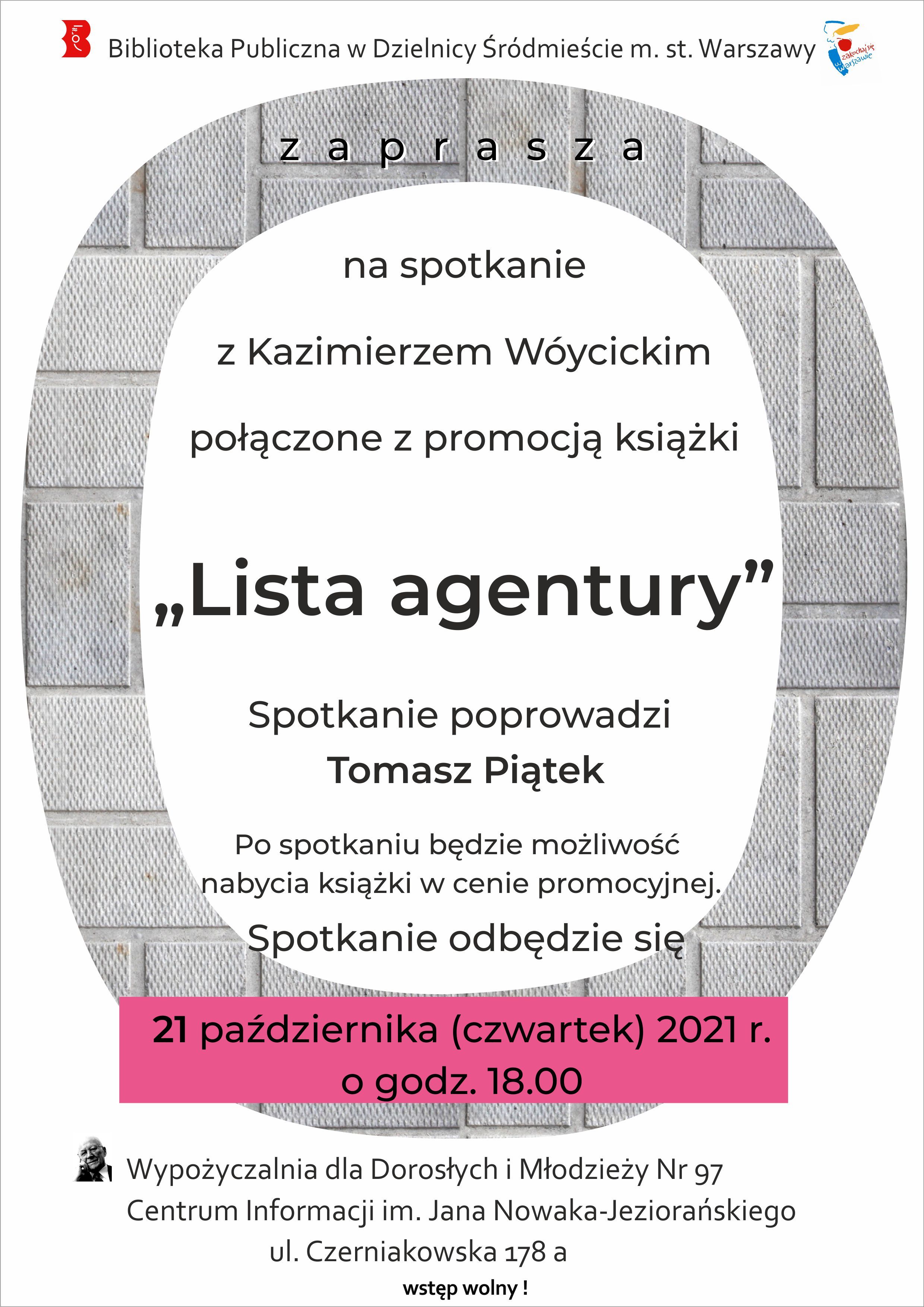 Biblioteka Publiczna w Dzielnicy Śródmieście m.st. Warszawy zaprasza do Wypożyczalni dla Dorosłych i Młodzieży nr 97 i Centrum Informacji im. Jana Nowaka-Jeziorańskiego przy ul. Czerniakowskiej 178a na spotkanie z Kazimierzem Wóycickim, połączone z promocją książki „Lista agentury”.