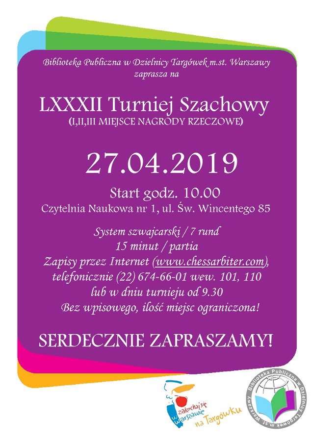 Biblioteka Publiczna w Dzielnicy Targówek m.st. Warszawy zaprasza sympatyków gry w szachy na 82 Turniej Szachowy.