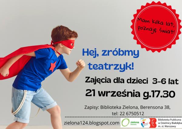 Zaczynamy 21 września warsztatami teatralnymi: Hej, zróbmy teatrzyk! Będą pacynki, marionetki i kukiełki. Będziemy aktorami i reżyserami. Zrobimy własne przedstawienie!