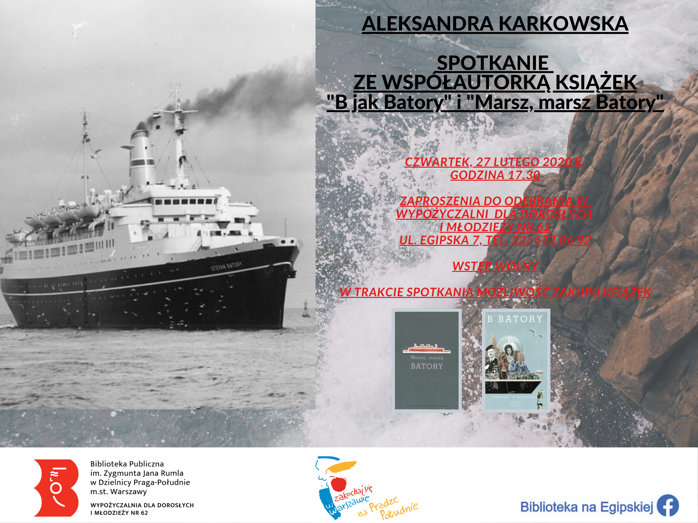 Zapraszamy wszystkich, małych i dużych, na nietypowe spotkanie z Aleksandrą Karkowską. Współautorka książek „B jak Batory” i „Marsz, Marsz Batory” opowie nam więcej o losach słynnego statku.
