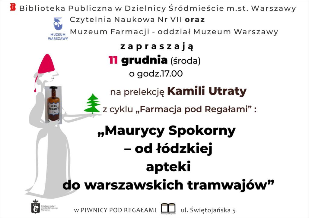 Będzie to prelekcja Kamili Utraty pt. „Maurycy Spokorny – od łódzkiej apteki do warszawskich tramwajów”.