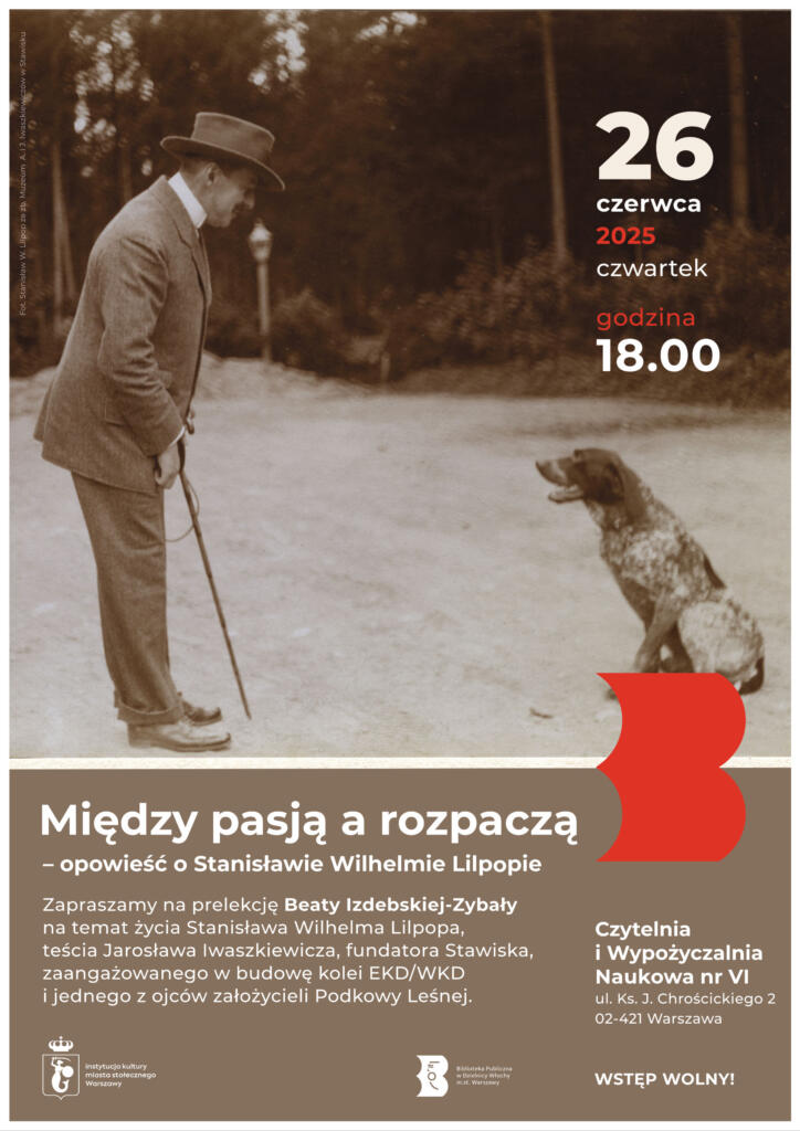 W czwartek 26 czerwca 2025 o godz. 18.00 zapraszamy do Czytelni i Wypożyczalni Naukowej nr VI na prelekcję Beaty Izdebskiej-Zybały nt. życia Stanisława W. Lilpopa, teścia Jarosława Iwaszkiewicza, fundatora Stawiska, zaangażowanego w budowę kolei EKD/WKD, jednego z ojców założycieli Podkowy Leśnej.