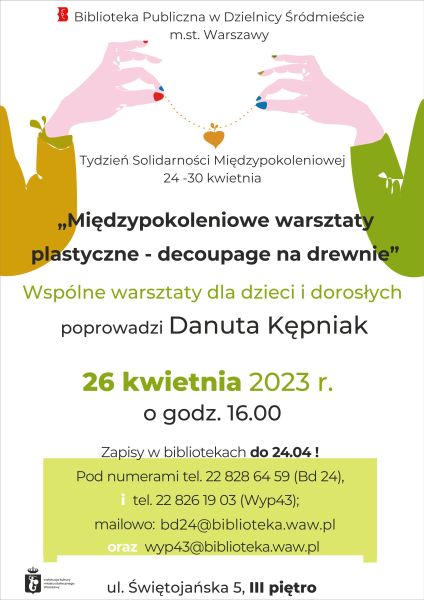 Biblioteka Publiczna w Dzielnicy Śródmieście m.st. Warszawy zaprasza dzieci i dorosłych na „Międzypokoleniowe warsztaty plastyczne – decoupage na drewnie”. Spotkanie 26 kwietnia o godzinie 16:00 poprowadzi Danuta Kępniak.