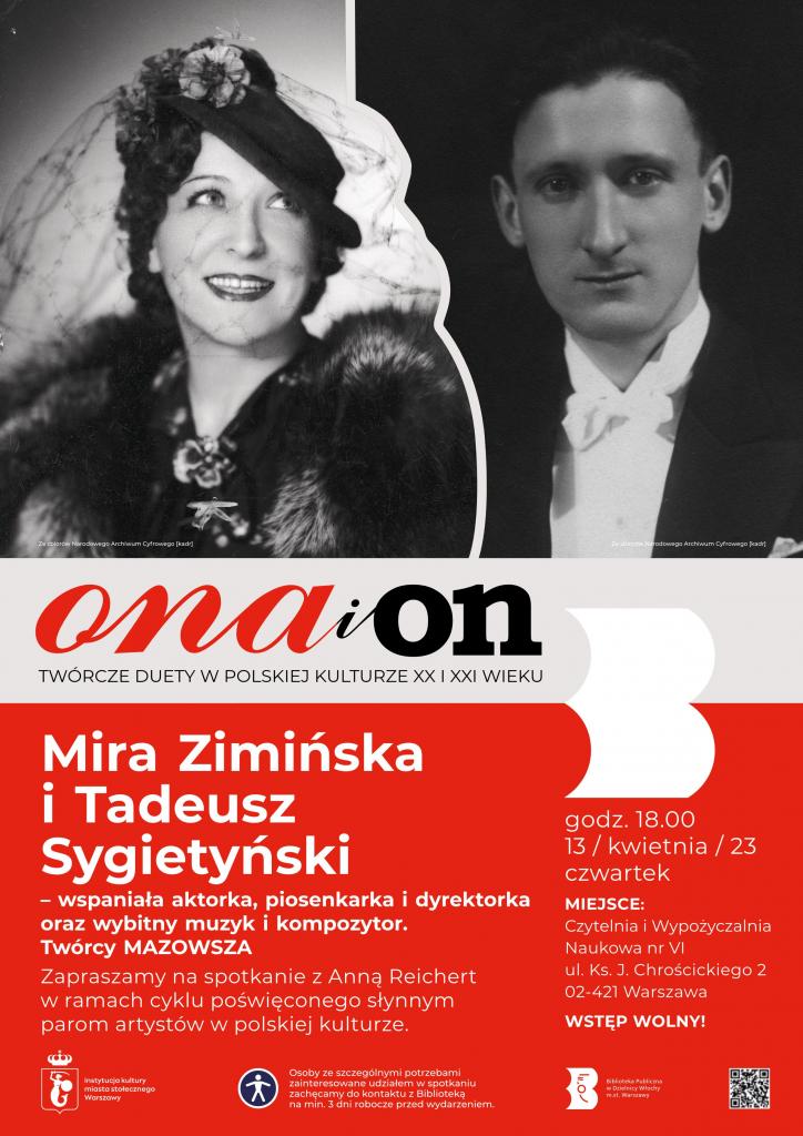 W czwartek 13 kwietnia 2023 o godz. 18.00 zapraszamy do Czytelni i Wypożyczalni Naukowej nr VI na kolejne spotkanie z Anną Reichert z cyklu „Ona i On. Twórcze duety w polskiej kulturze XX i XXI wieku”. Tytuł kwietniowej prelekcji brzmi: „Mira Zimińska i Tadeusz Sygietyński – wspaniała aktorka, piosenkarka i dyrektorka oraz wybitny muzyk i kompozytor. Twórcy MAZOWSZA”