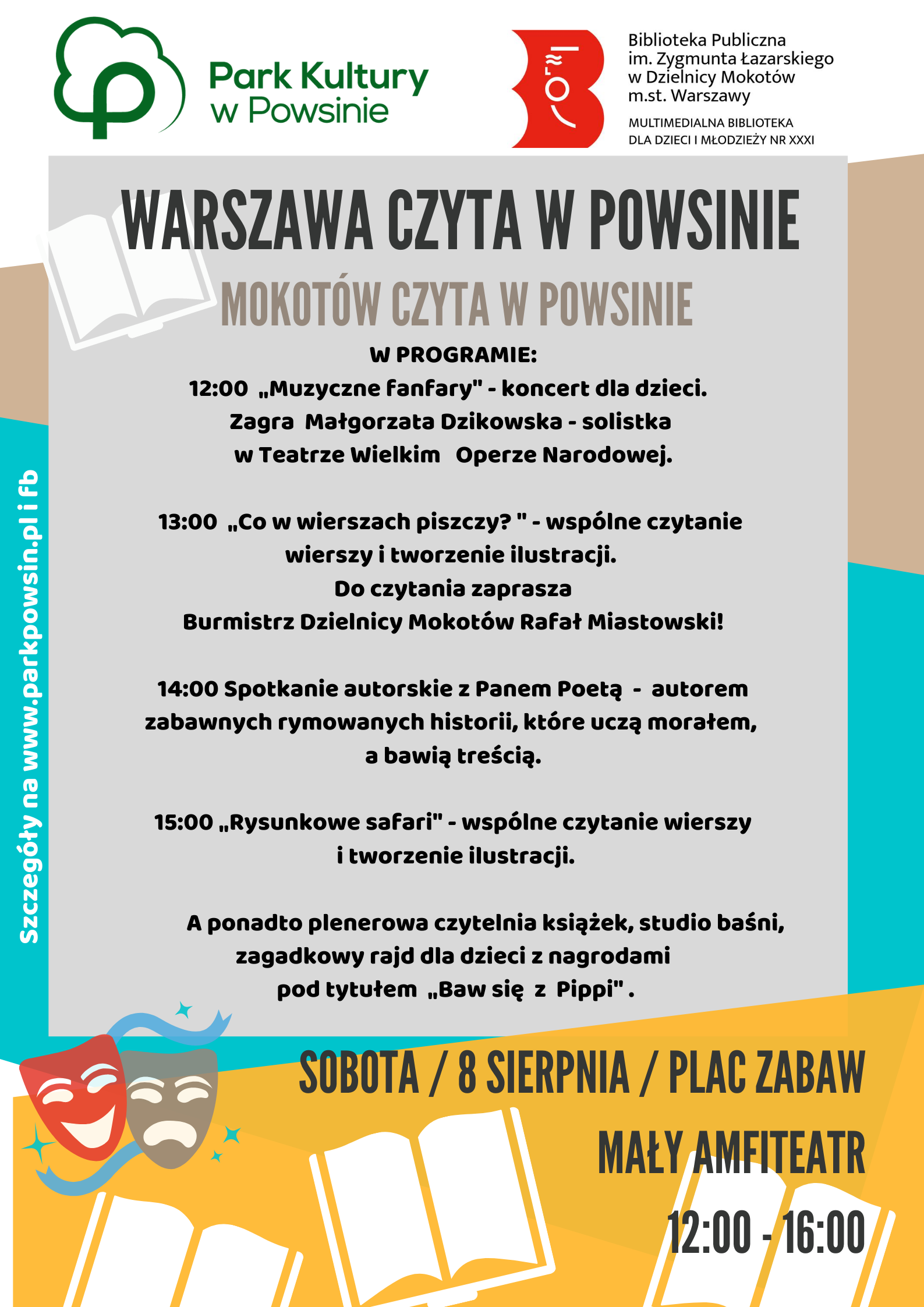 Piknik „Warszawa czyta w Powsinie – Mokotów czyta w Powsinie” odbędzie się 8 sierpnia od 12.00 do 16.00. Na najmłodszych czekają spotkania literackie w studiu baśni, zagadkowy rajd z Pippi, czy spotkanie z Panem Poetą. Nie zabraknie czytania wierszy z Rafałem Miastowskim, burmistrzem dzielnicy Mokotów m.st. Warszawy i przeglądania książek w plenerowej czytelni. Spotykamy się na Placu Zabaw i w Małym Amfiteatrze.