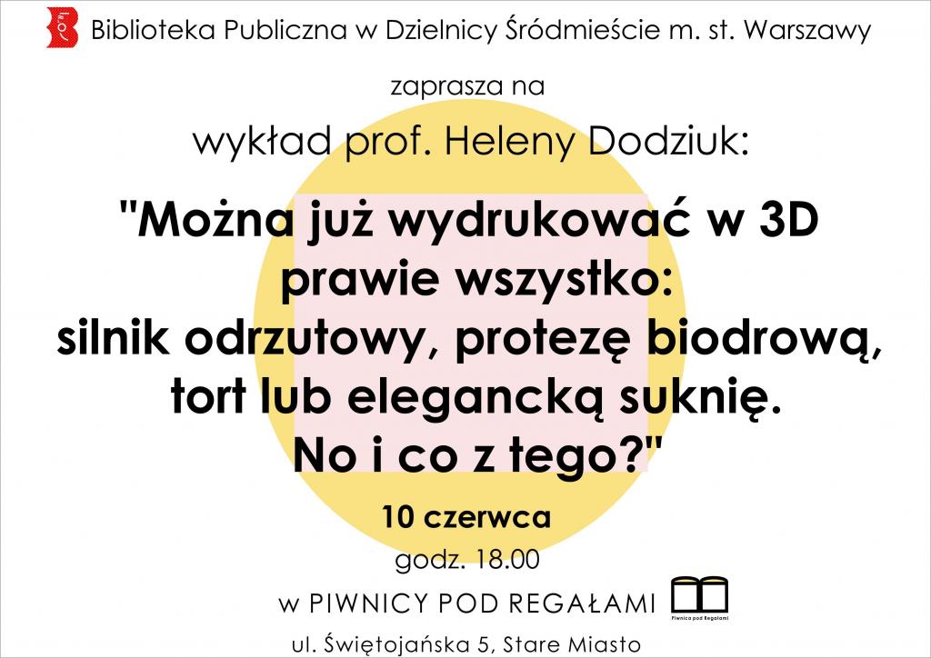 W poniedziałek 10 czerwca o godzinie 18:00 w „Piwnicy pod Regałami”, odbędzie się wykład prof. Heleny Dodziuk pt. „Można już wydrukować w 3D prawie wszystko: silnik odrzutowy, protezę biodrową, tort lub elegancką suknię. No i co z tego?”.
