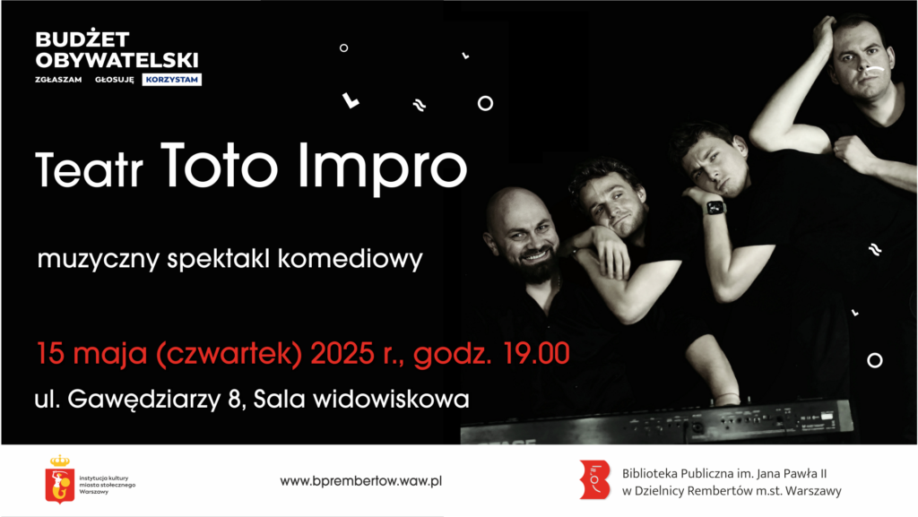 Występ grupy improwizacyjnej Toto Impro odbędzie się 15 maja 2025 r. o godzinie 19.00 w sali widowiskowej biblioteki w Rembertowie, przy ul. Gawędziarzy 8. Wydarzenie realizowane jest ze środków Budżetu Obywatelskiego. Wstęp wolny.
